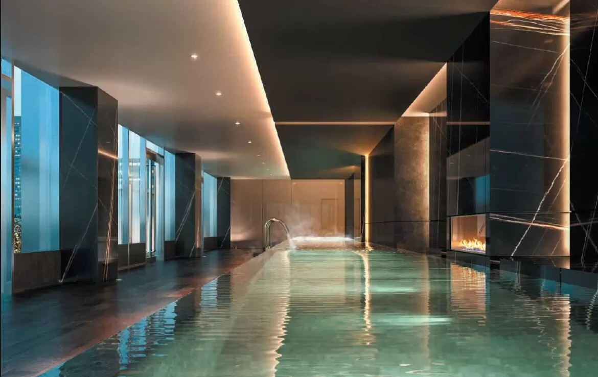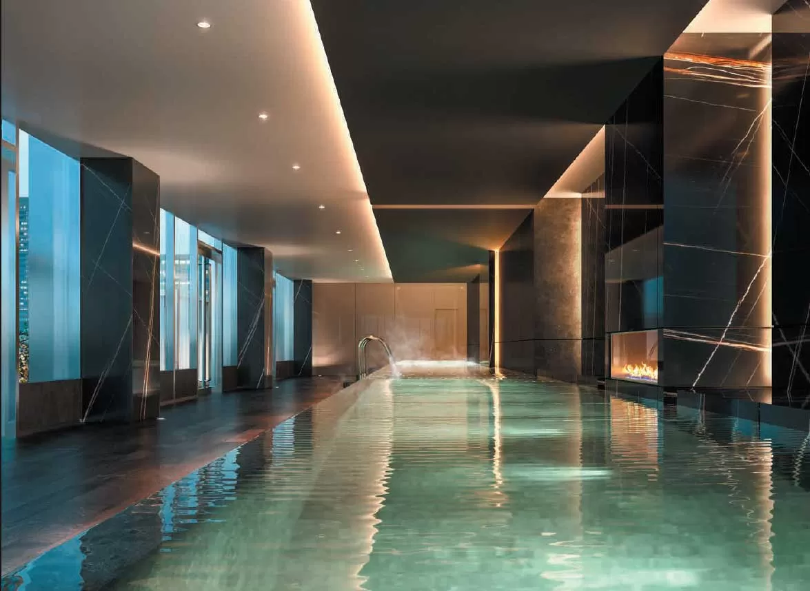 LUMINOUS MOONLIGHT AND RECESSED MOOD LIGHTING CAPTURE THE RIPPLING SURFACE OF THE INDOOR/OUTDOOR POOL DAY AND NIGHT, SPARKLING LIKE A PRECIOUS GEMSTONE NEXT TO THE BLACK AND WHITE STONE WALLS. SLIP INTO THE HOT TUB OR UNDER THE WATERFALL AND FEEL YOUR STRESS MELT AWAY.
