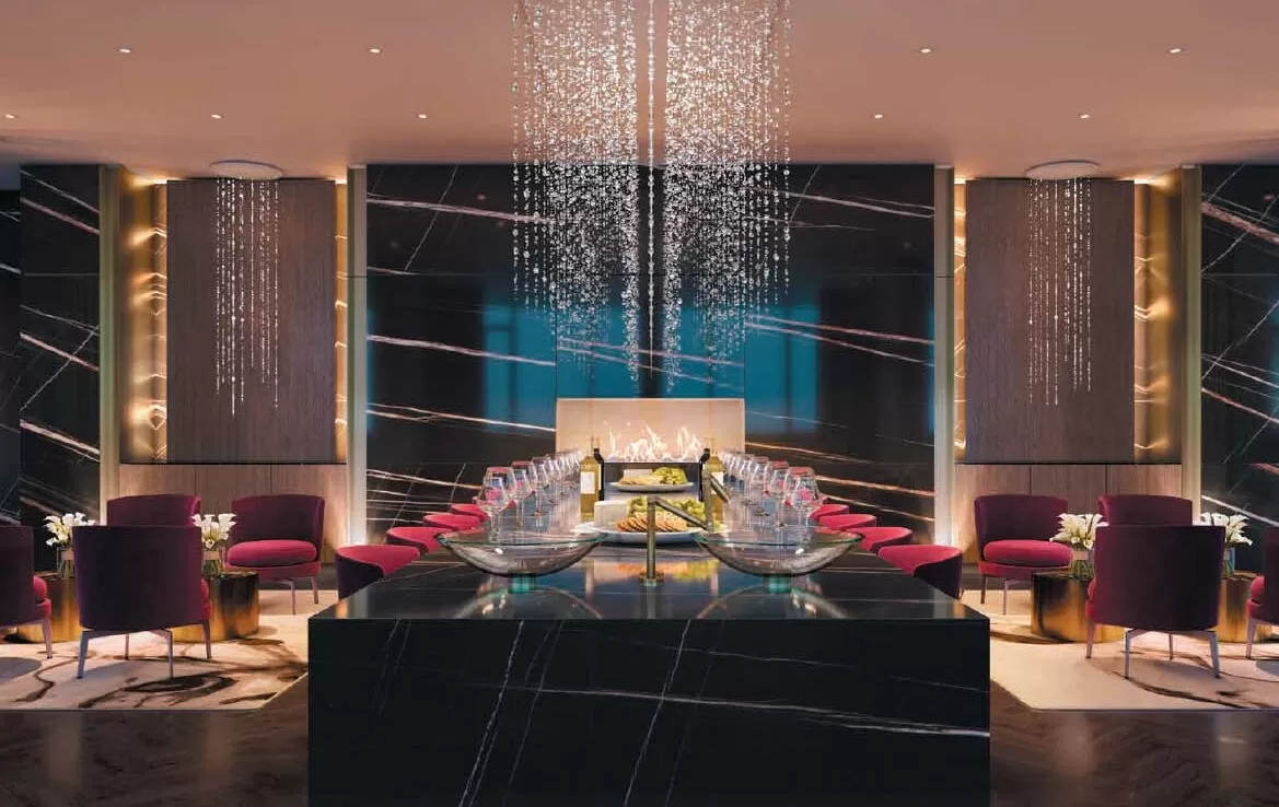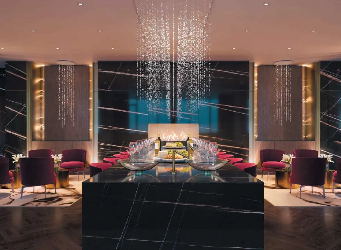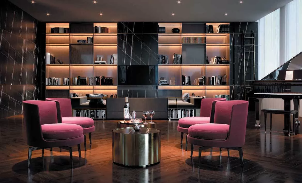CHIC SURFACES OFFER ENDLESS OPTIONS TO SAVOUR THE VIEW OF THIS MODERN SPEAKEASY. FROM THE POLISHED WOOD FLOORS AND BRONZE -DETAILED BOOKSHELVES, TO THE GLEAMING SURFACE OF THE BABY GRAND, THIS PIANO BAR MAKES EVERY VISIT A VIP EVENT.