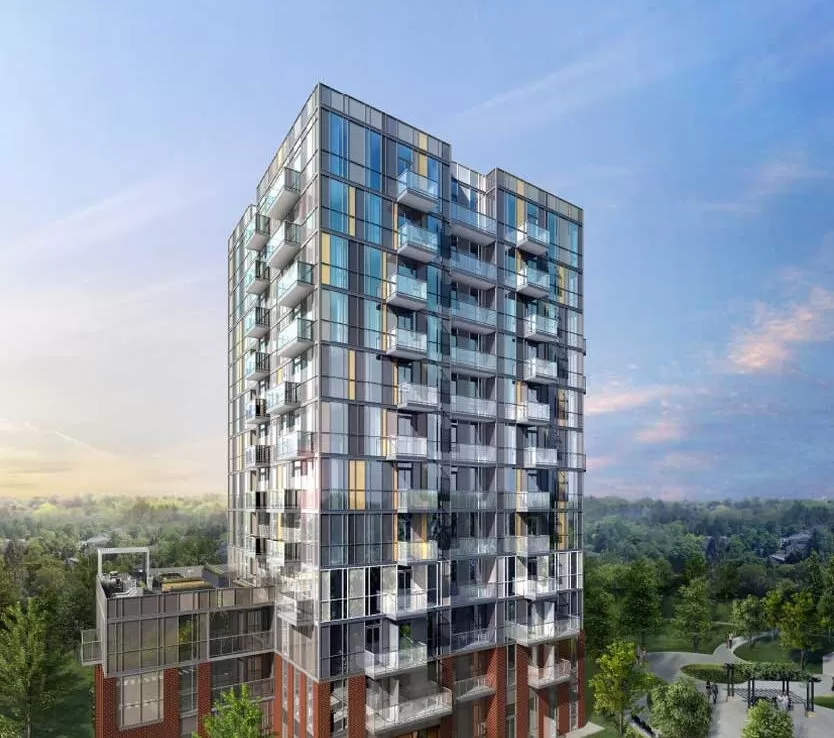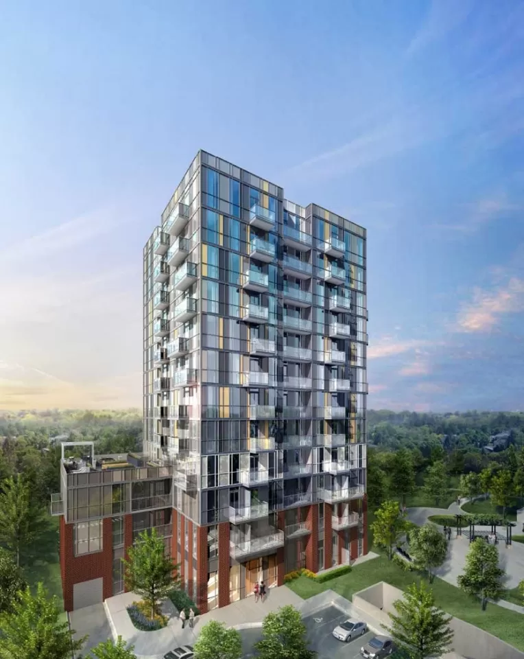 The 12-storey tower will rise from the triangular site bordered by green on two of its three sides, including a hydro corridor to the south and Shaver’s Trail to the east.