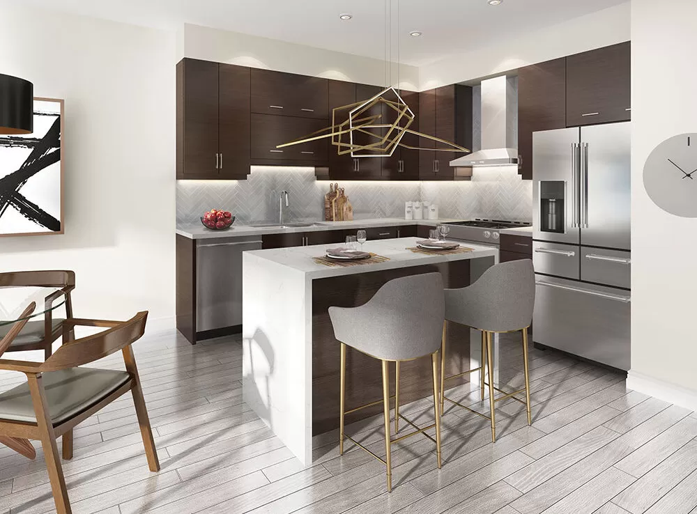 Chef-inspired kitchens come outfitted with extended cabinetry, ceramic backslashes and sleek stainless steel appliances. Chat with guests over wine while prepping dinner at the island, or relax here over coffee and a crossword, come the weekend.
