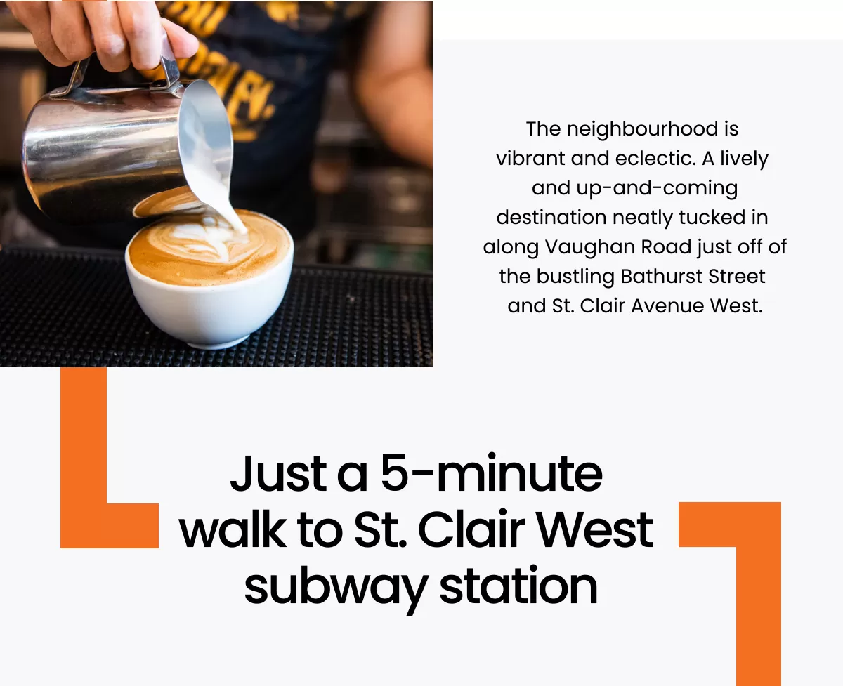 A lively up-and-coming destination neatly tucked in along Vaughan Road just off of bustling Bathurst St and St. Clair Ave West. Closely connected to St. Clair West Village, Wychwood, and Forest Hill, so whatever rocks your world – it’s right there.