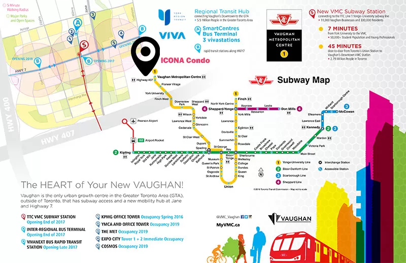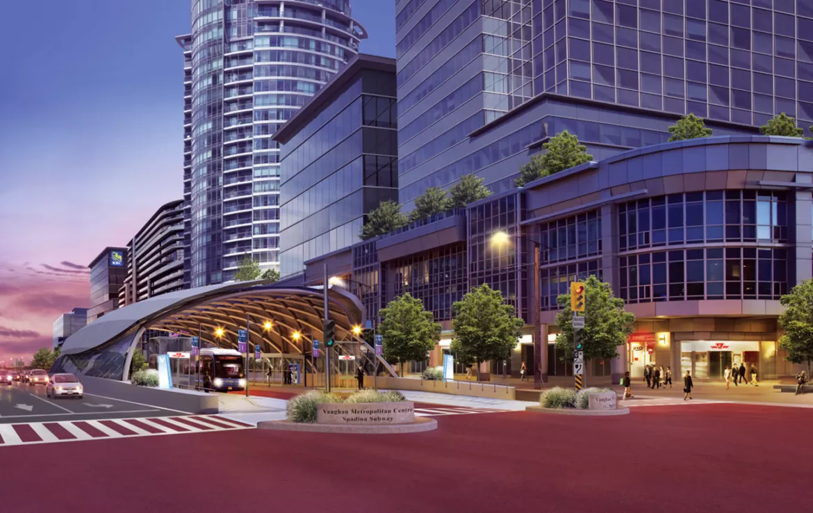 The largest and most significant development project in Vaughan’s history, the VMC sits on a 179 hectare site (442 acres) that will include more than 1.5 million square feet of commercial office space, 750,000 square feet of new retail space, 12,000 residences, unique cultural spaces, hotels and entertainment venues. It is anticipated that more than 20,000 people will be passing through the VMC Mobility Hub daily, commuting to York University; connecting to vibrant entertainment hubs, leading healthcare research centres and the country’s powerful financial and legal corridors. Bay Street to the VMC is a 45 minute ride – access to clients, collaborators and home using the most modern and integrated public transit systems