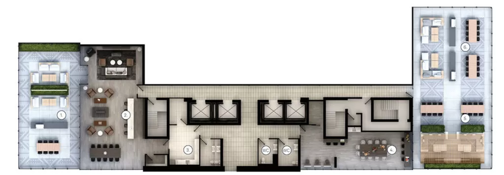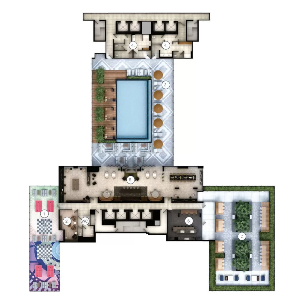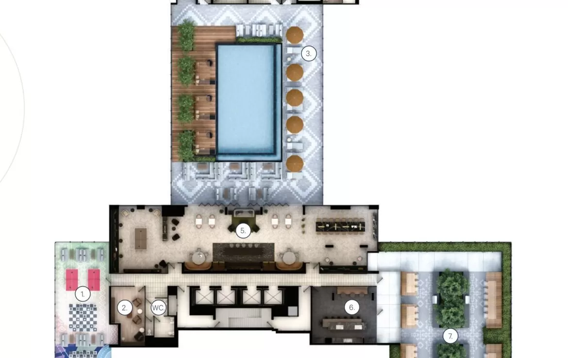1. Outdoor Games Lounge 2. Library Lounge 3. Outdoor Pool & Lounge 4. WC & Change Room 5. Social Club & Shared Work Space 6. Demo Kitchen 7. Outdoor BBQ & Dining Lounge