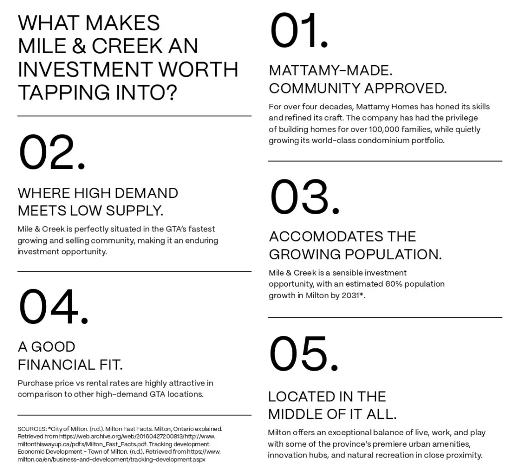 A place steeped in history & spurring innovation. Milton is the land of ands, not “if onlys”. A community comprised of everything you need & even more than you imagined. Close to amenity & tucked away from congestion. Room to grow & a space to call your own. Set against protected greenspace & set six storeys high above expectation. With Sixteen Mile Creek rolling through the landscape, with trails and peaks surrounding a dynamic downtown stretch, Mile & Creek Phase-3 is surrounded by verdant protected greenspace. In the final phase of this master planned condo community, what matters most runs course with what makes a place worth calling your own.