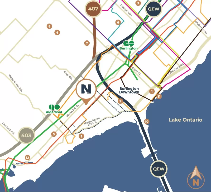 Between Burlington Transit, GO Transit, and three major highways, commuting to and from Burlington is a breeze. At NORTHSHORE, two bus routes stop right outside the door, taking residents straight to downtown Burlington, right into Hamilton, or to the Aldershot GO Station for a quick trip into Toronto.