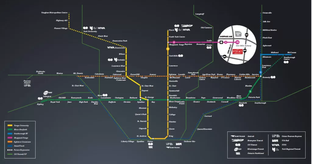 The Point puts you near the Don Mills subway stop. You can access the downtown core, even during rush hour, with efficiency and in comfort in just over a half-hour*. And you have efficient access to all points within the city – and to regional transit to take you further out. Like UP Express to Pearson International Airport, VIA Rail, plus the Mississauga, Brampton and York Region transit systems.